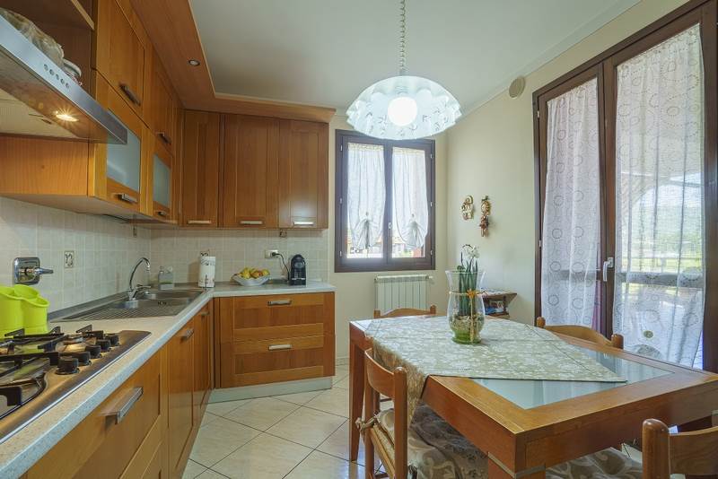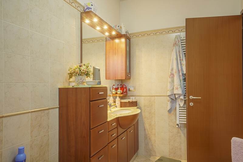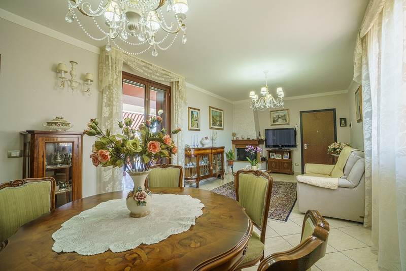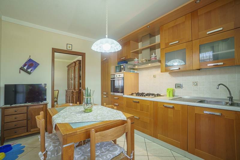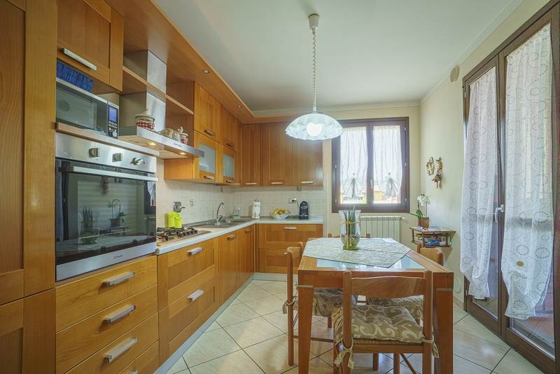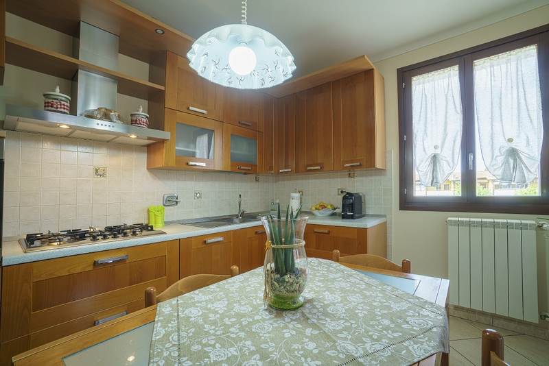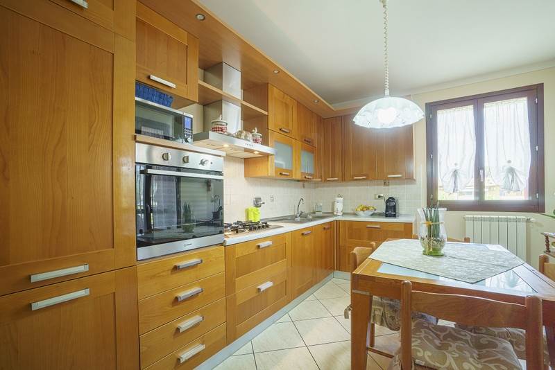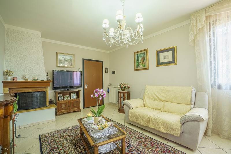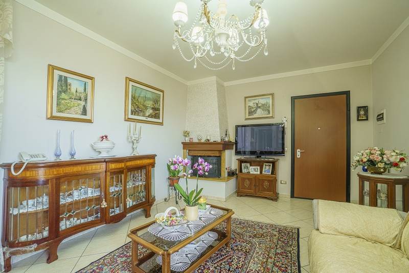 L’ingresso è nell’ampio soggiorno, luminoso grazie alla doppia esposizione ed è arricchito da un caminetto che tiene compagnia nelle sere invernali; una porta finestra consente di accedere alla terrazza dove è possibile ospitare a cena gli amici, molto pratica perché collegata alla cucina abitabile.