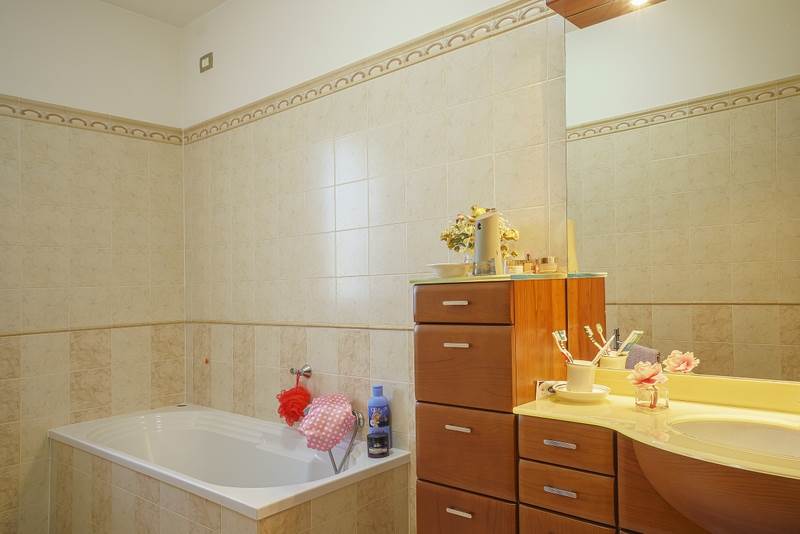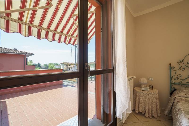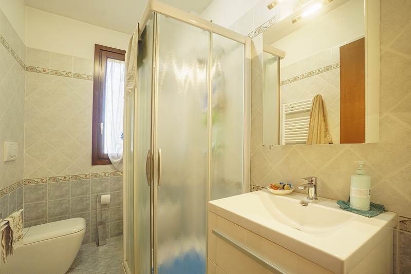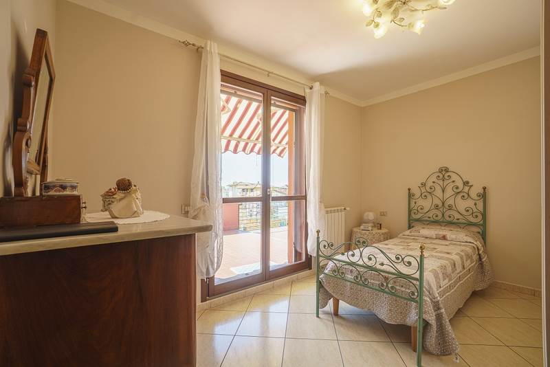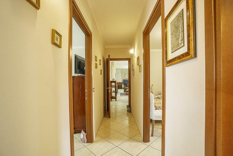 Un corridoio separa la zona giorno dalla zona notte e distribuisce le tre camere da letto – la padronale e due più piccole, una con accesso alla seconda terrazza e l’altra con balcone – e i due bagni, uno con doccia e l'altro con vasca, entrambi con finestra.