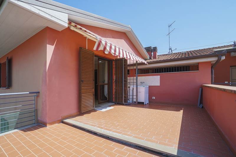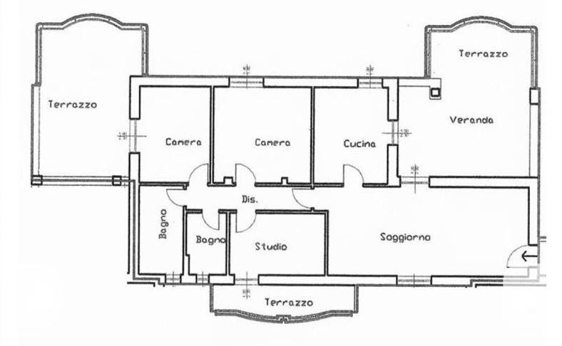 Posto all’ultimo piano, servito da ascensore, l’appartamento è di fatto libero sui quattro lati, perché confina con le altre unità solo su due angoli.