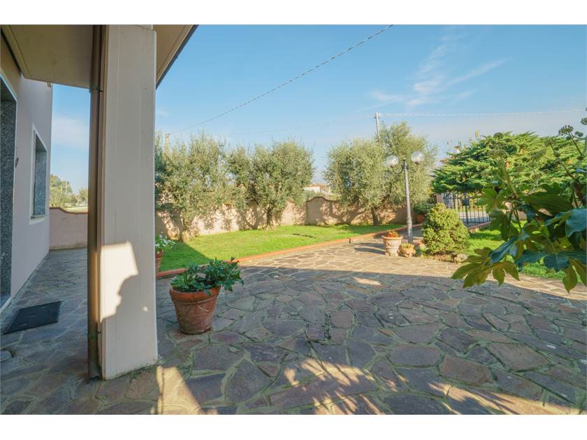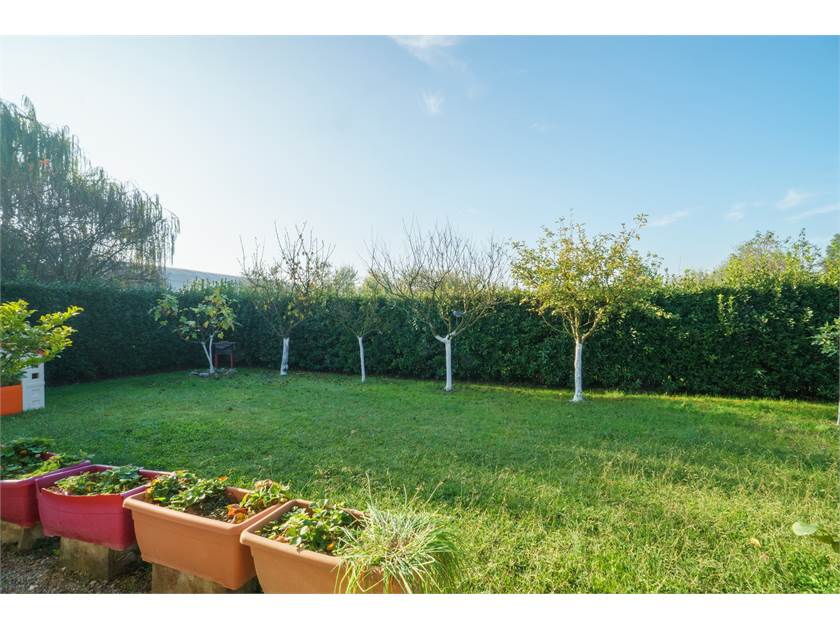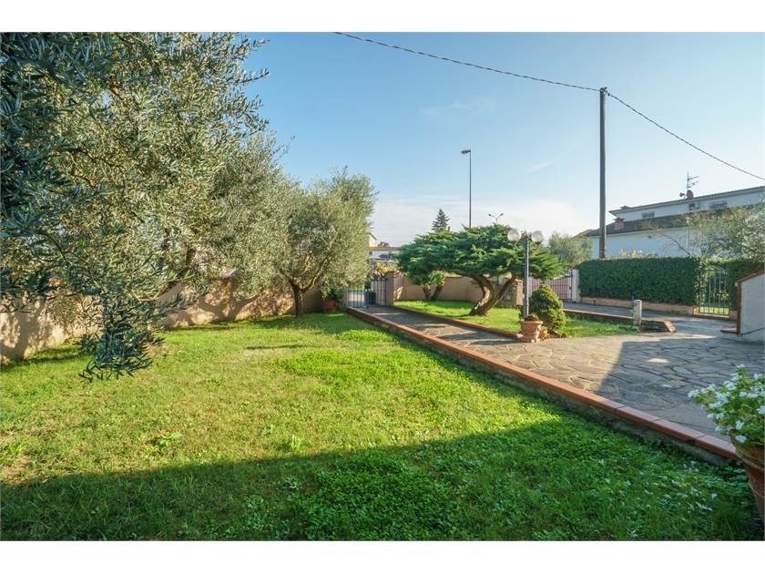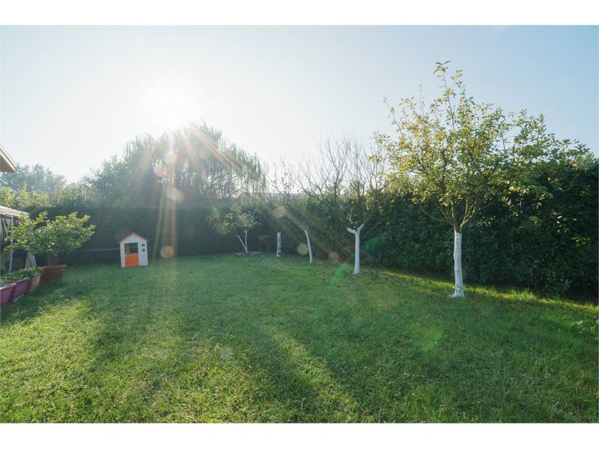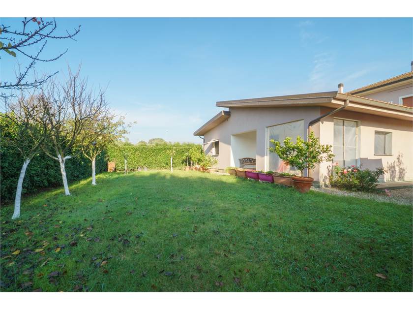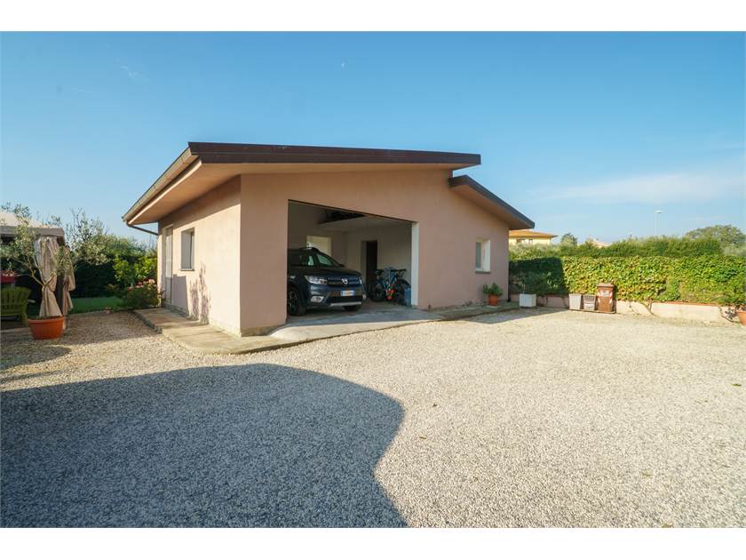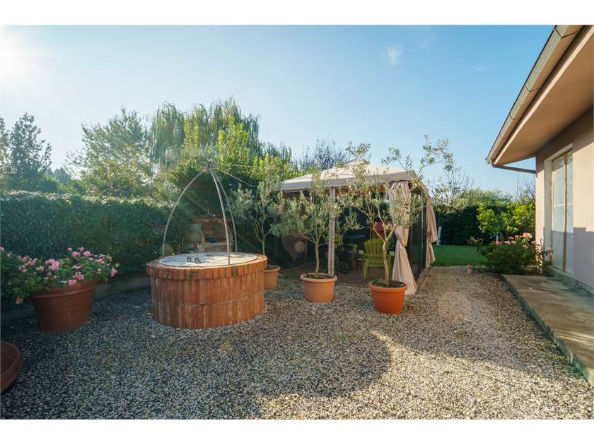 Di fronte all’ingresso di servizio è presente un garage esclusivo di oltre 30 mq, completo di locali di deposito, mentre al piano interrato si trova una cantina di circa 30 mq, utile come spazio accessorio aggiuntivo. La proprietà, libera su quattro lato, è circondata da un giardino diviso tra fronte e retro per un totale di circa 450 mq. È inoltre presente un pozzo regolarmente denunciato, utilizzabile per l’irrigazione e per usi domestici non alimentari.
