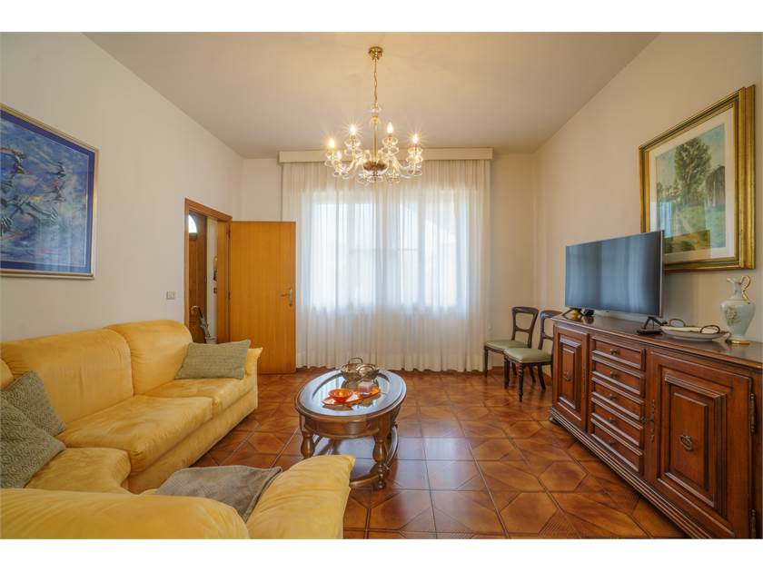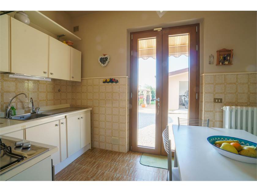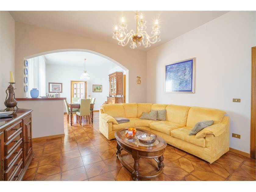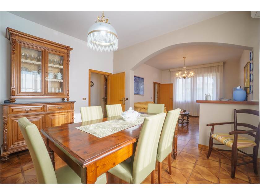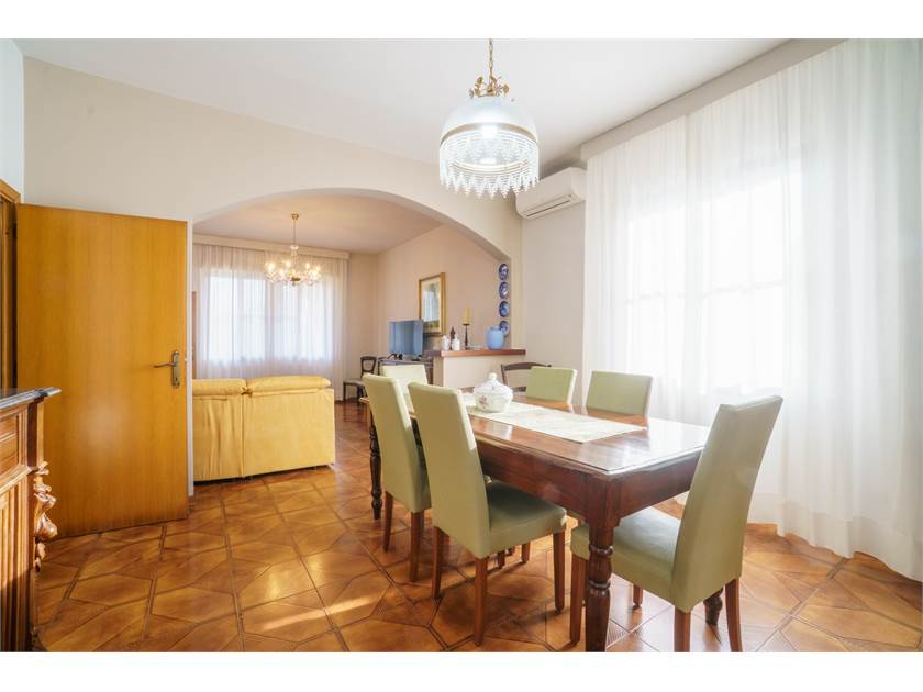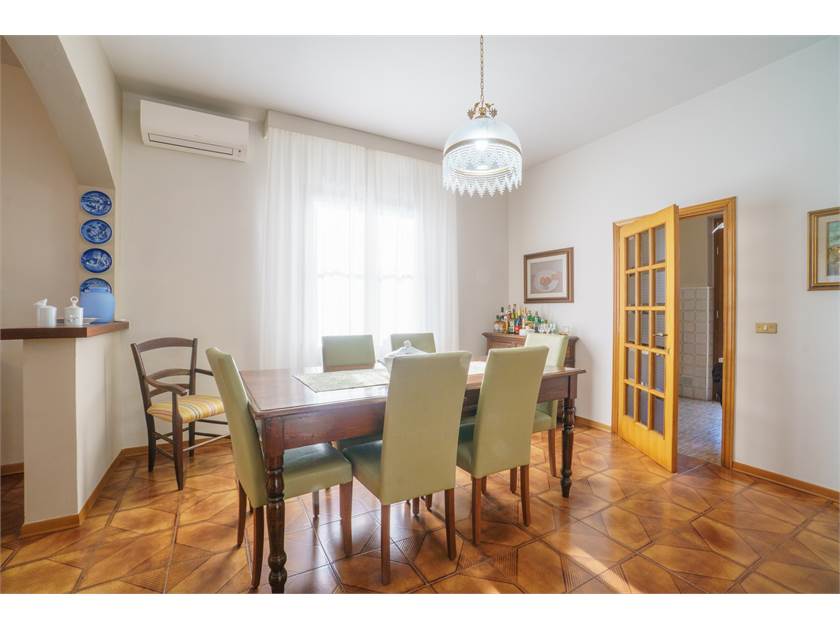 L’ingresso introduce nella zona giorno, composta da un soggiorno spazioso che comunica con la sala da pranzo. Accanto si trova la cucina, dotata di un’uscita di servizio verso il cortile laterale, utile per raggiungere comodamente le pertinenze esterne.