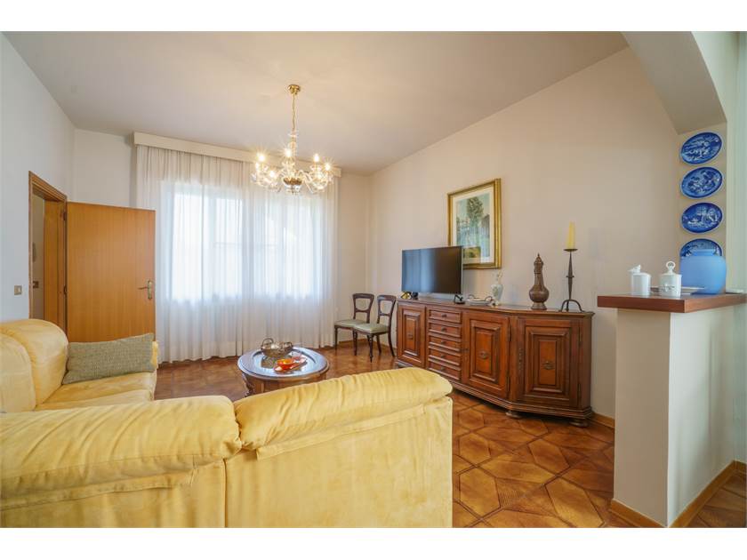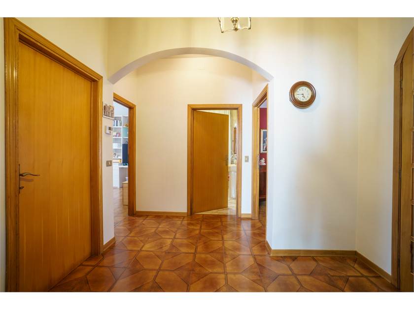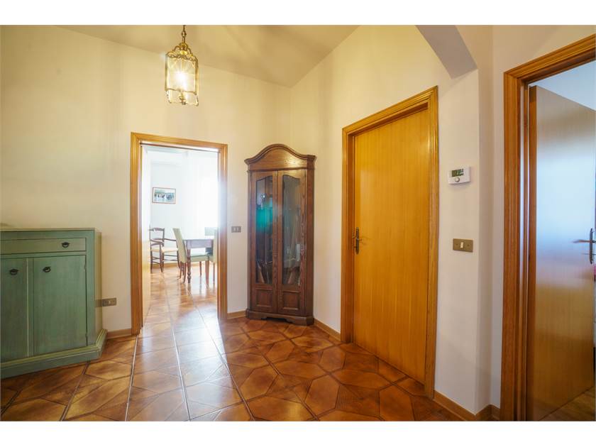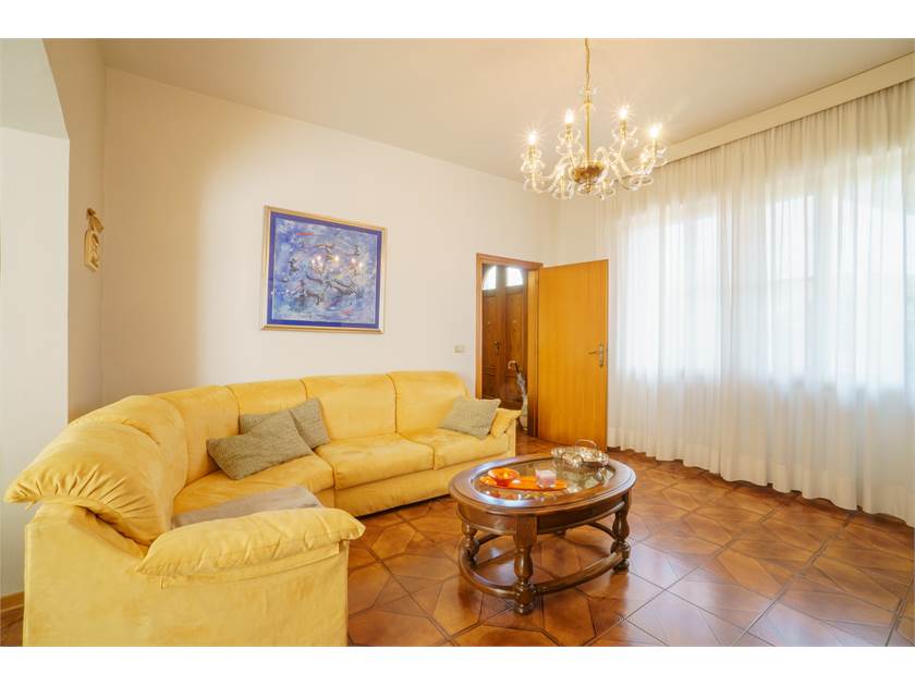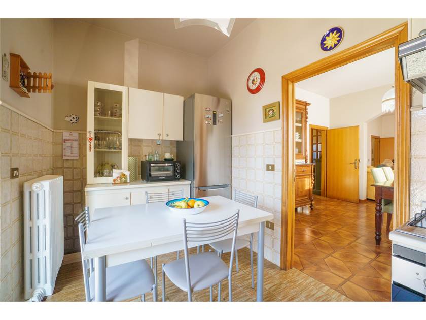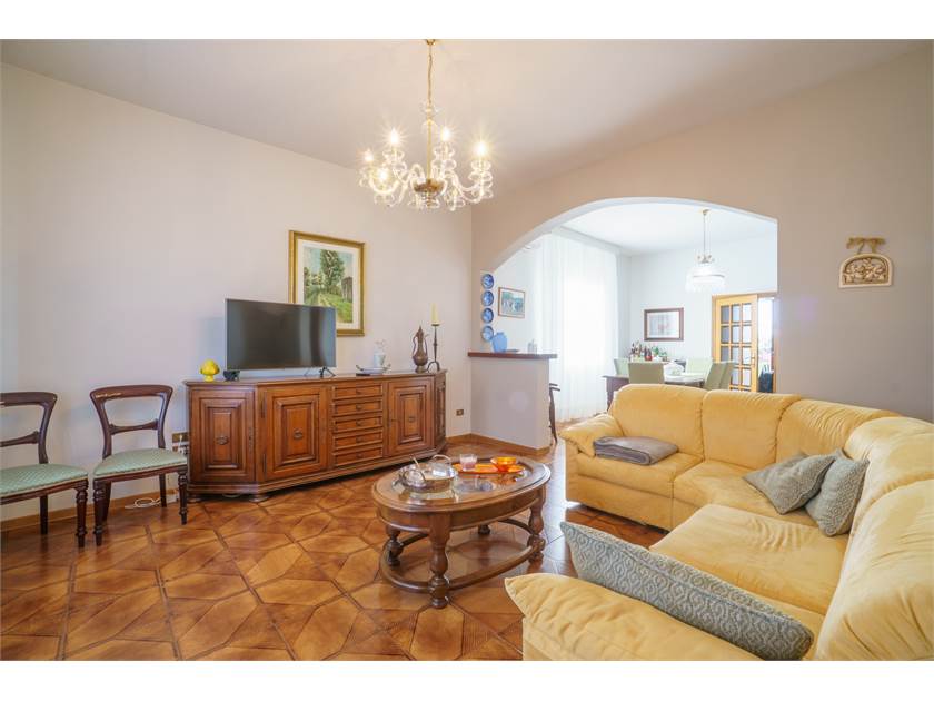 L’ingresso introduce nella zona giorno, composta da un soggiorno spazioso che comunica con la sala da pranzo. Accanto si trova la cucina, dotata di un’uscita di servizio verso il cortile laterale, utile per raggiungere comodamente le pertinenze esterne.